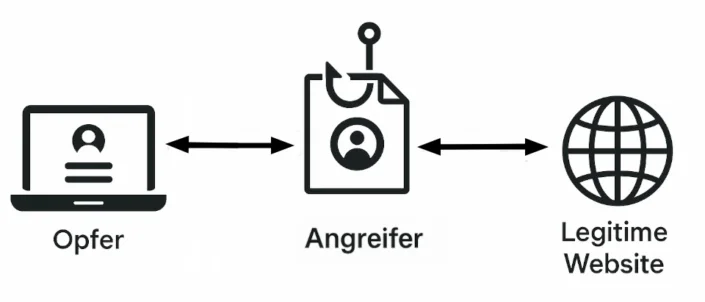 Das neuste Werkzeug im Werkzeugkasten der Angreifer ist das sogenannte Man-in-the-Middle (MitM) Phishing. Hier sitzt der Angreifer durch den Einsatz eines sogenannten Reverse-Proxys quasi in der Mitte zwischen dem Nutzer und dem echten Anmeldeserver und kann trotz MFA eine gültige Nutzersession erlangen.